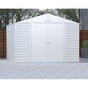 The Arrow Select line of strong, sturdy steel storage sheds is a pleasant addition to your backyard. Made with galvanized steel that is treated to provide long-term protection against corrosion and rust, Arrow Select sheds are engineered to protect your stored items from the elements. The Arrow Select line also has a high gable roof to prevent pooling of rainwater and debris, built-in air vents for better circulation, and locking door handles for security. It also has a smooth, strong Sherwin-Williams Paint Finish that protects it from the elements and gives the steel extra protection from rust and corrosion.